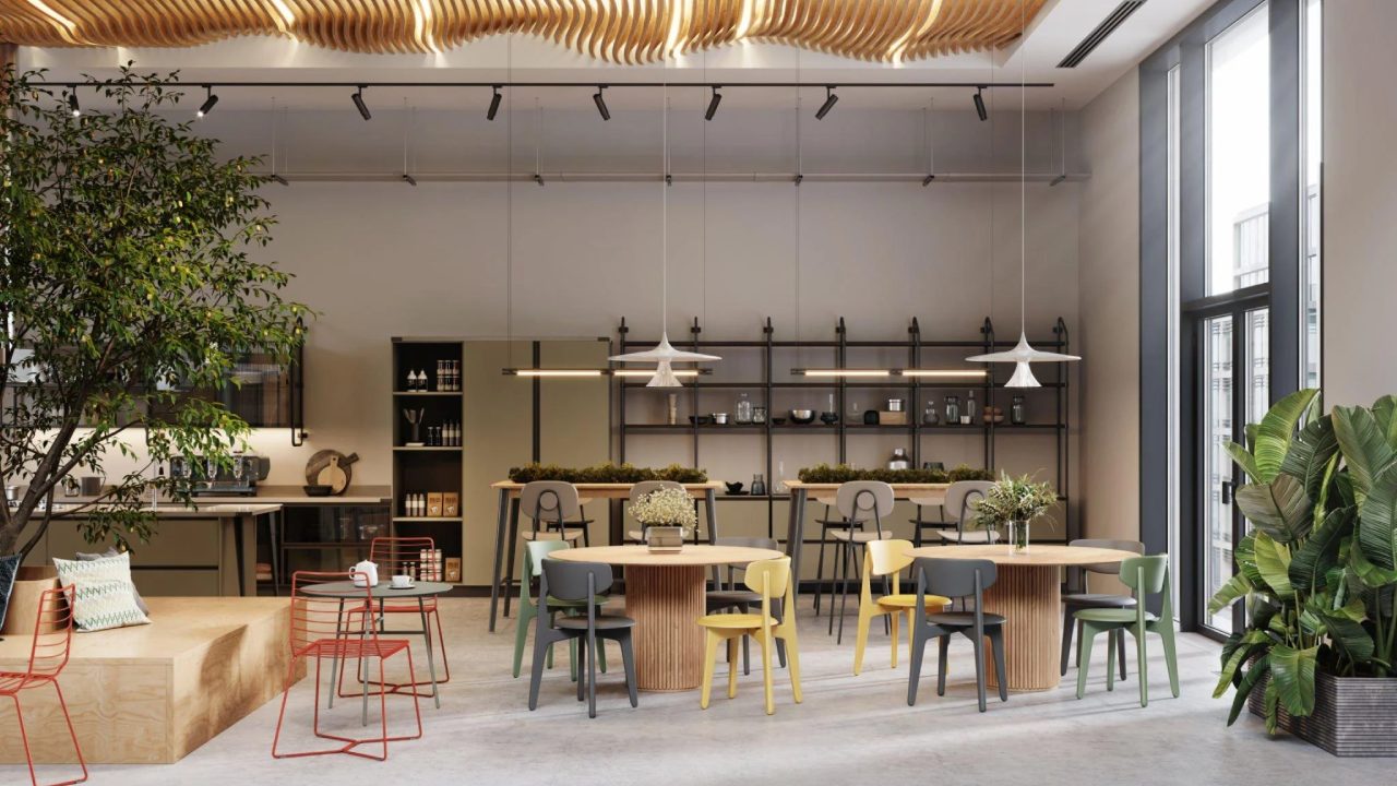 The cafeteria is an important part of the office environment, as it can be a place for employees to chat and socialize, as well as a place to refuel.